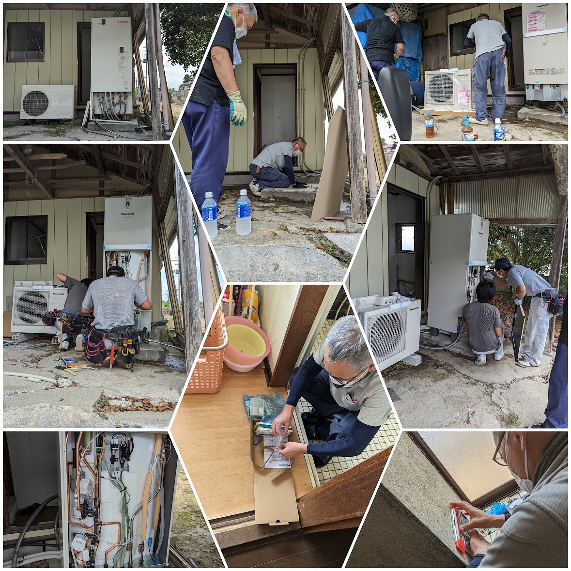 古い設置状況によっては土台のズレや配管の劣化が激しいケースもあるため、既存の下地をしっかり調査してから基礎補強を行いました。写真は撤去作業と配管接続、外部配管の整理を行っている様子です。